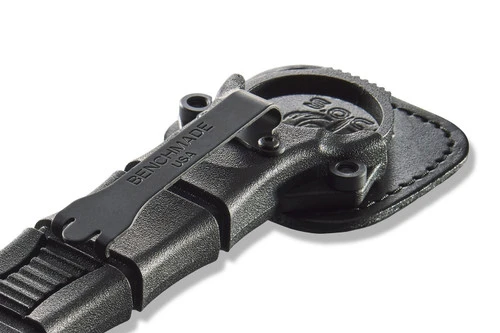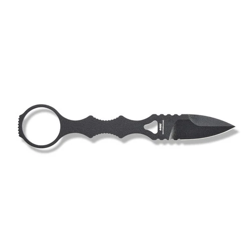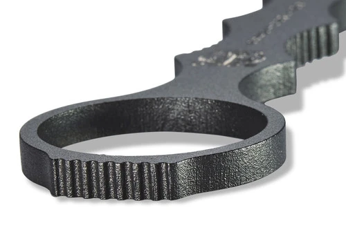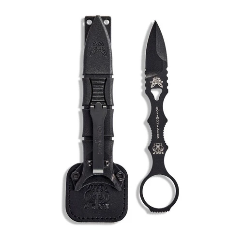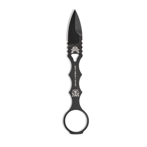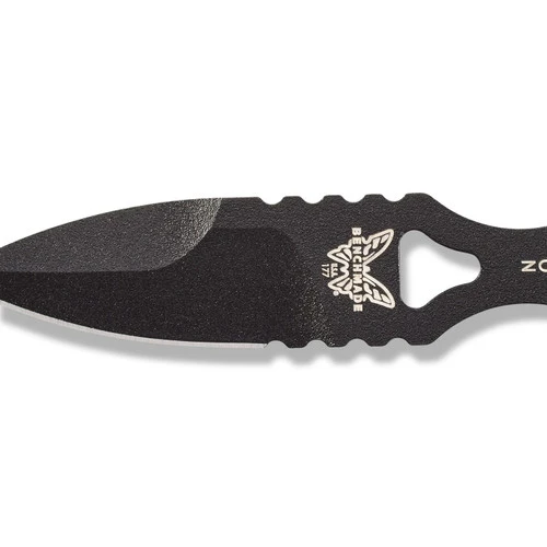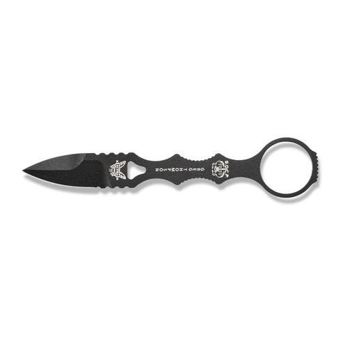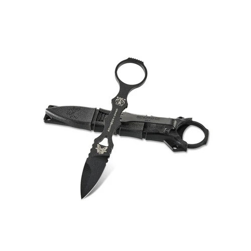 Born in the line of duty, designed for the daily grind. The 177BK Mini SOCP® delivers peace of mind in a slim, concealable platform. Benchmade has scaled down the popular SOCP fixed blade for more convenient carry. This model is made from 440C stainless steel in a black cerakote finish. Three finger grooves on either side of the handle and a kunai-style finger ring provide grip dexterity. Includes a hard-molded sheath with a high retention deep-carry pocket clip for secure concealed carry.