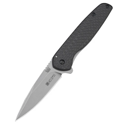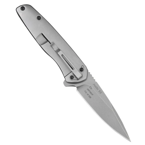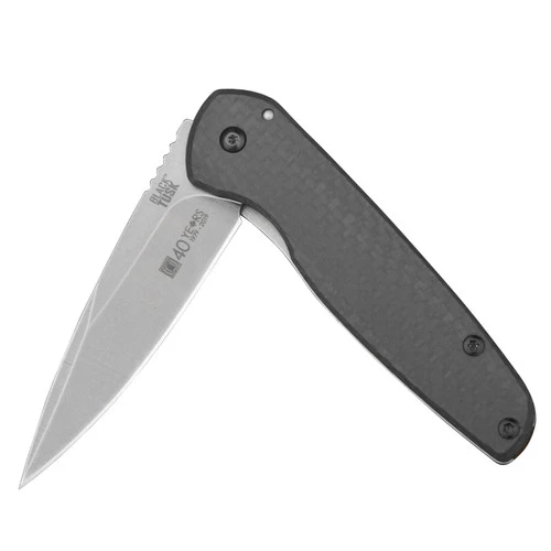 Considered a perfectly sized gentleman’s knife, this limited edition Black Tusk Arete is a convenient and compact length, measuring only 3.5” when closed. Featuring a ground spear-point blade constructed of D2 steel, the Arete opens with a convenient flipper and locks solidly using a frame lock design. The ball bearing system ensures smooth opening, allowing for quick deployment, even one-handed. With a slim, deep carry pocket clip, it rests discreetly in your pocket. This House of Knives 40th anniversary model features a carbon fibre handle and bronze colour backspacer. With only 125 knives produced, this limited edition Arete is a stunning addition to any collection. Also available in , , and .