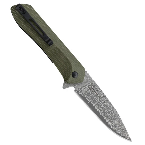 This model features a green Micarta handle and a 69 layer Damascus-clad blade with a 10Cr15CoMoV core