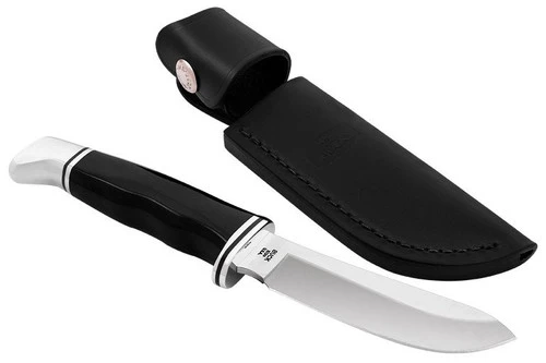 Fixed-blade hunting knife. Turned down point lets blade cut without snagging. Sheath included.