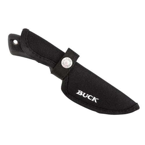 Smallest of the Buck BuckLite Max II family, this knife is perfect for hunting or as a general outdoor knife. The ergonomic handle is constructed out of Dynaflex rubber for superior grip, performance and light weight. There is a lanyard hole on the handle for different attachment options. The drop point blade has been ntumbled finished, for a less porous, improved corrosion resistance. There is jimping on the spine for added control when doing detailed work. This knife features full tang construction for added strength and reliability. Buck’s advanced Edge2x blade technology has been applied to the blade resulting in insane sharpness out of the box. Incleads an imported heavy-duty, black polyester sheath.Â