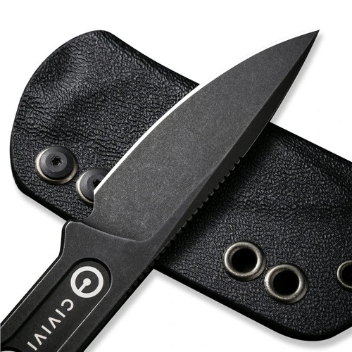 The black stonewashed CIVIVI Circulus is a small, skeletonized fixed blade from Ostap Hel. This strong and durable neck knife comes with a kydexsheath, titanium bead chain, and a paracord lanyard for many carry options. Â