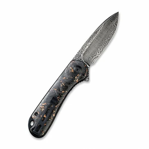 This CIVIVI Elementum features a shredded carbon fiber handle that includes gorgeous copper accents with a clear resin coat and a black hand rubbed Damascus clad steel blade.