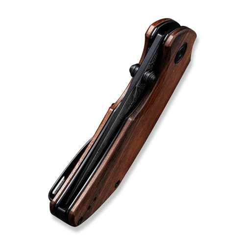 This model features a black hand rubbed Damascus clad 9cr tanto blade and Cuibourtia wood handle scales.Â