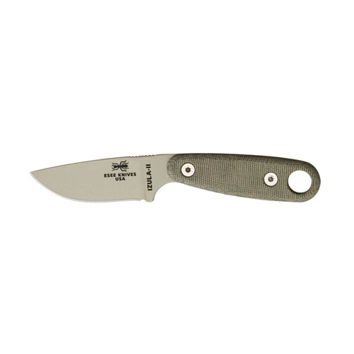 The locals in Peru call the meanest, nastiest ant of the jungle by the name “Isula” and we know it as the Bullet Ant. The Bullet Ant is known to be independent, tough, light on its feet, and a real aggressive survivor. The ESEE Izula II knife is built the same way and designed to be the perfect lightweight survival tool. Designed after the most popular knife in the ESEE line, the Izula II adds half an inch of length to the handle found on the standard Izula, and features full micarta handle scales.Â