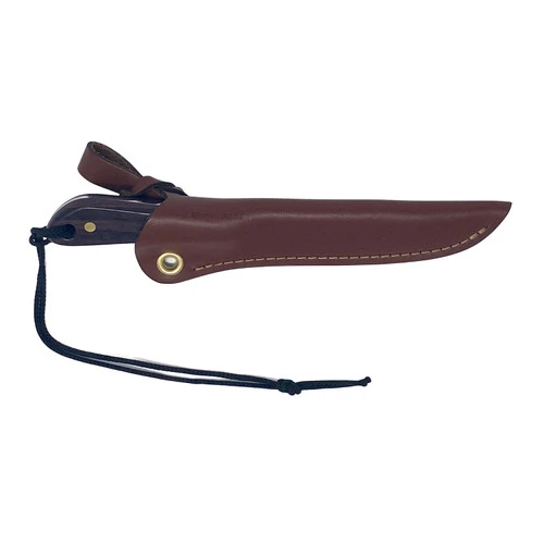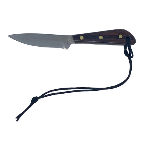 This model features a stainless steel blade with a regular grind and a rosewood handle. Regular “sabre” grind blade comes up about halfway on the blade. Our regular classic grind makes for a thicker, stronger blade, and was designed ideally for hunting and skinning/dressing.