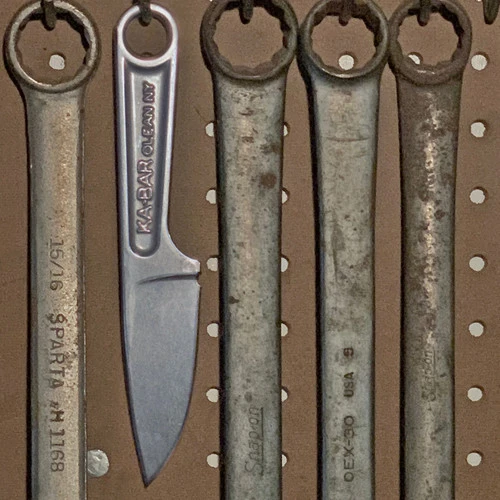 The KA-BAR Forged Wrench Knife is made in the USA with 425 High Carbon Stainless Steel. Â Due to the forging process, each knife will have a unique look. Includes a hard plastic sheath.