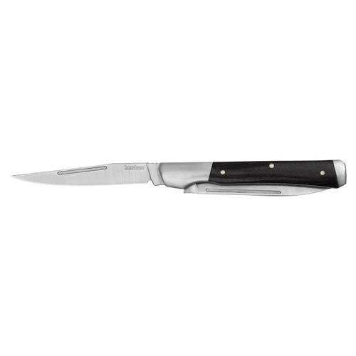- Polished canvas micarta handle; steel bolsters with steel liners