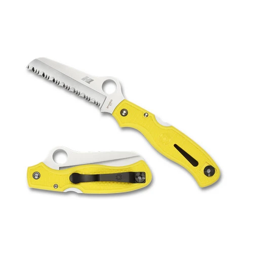 Spyderco’s Rescue knives are long favored by seafarers and the design has since been embraced by rescue workers, EMT’s and ranchers-anyone cutting around flesh in an emergency. The Atlantic Salt is a modified Rescue made with state-of-the-art, ultra-corrosion-resistant H-1 steel. The hollow-ground blade is available in SpyderEdge offering remarkable cutting performance in and around fresh and saltwater. The molded FRN handle includes a shackle key and is available in black or bright yellow and features a reversible black-coated titanium pocket clip for tip-up carry on either the left or right side. We recommend threading a thong or lanyard cord through the lanyard hole for back-up retention around water, where once dropped, a knife is often irretrievable or lost.