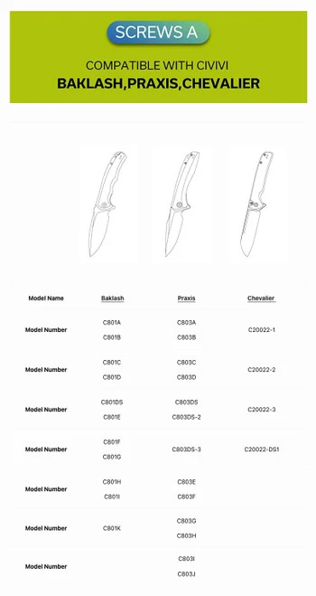 Made of premium titanium, this black clip and screws are durable and sturdy and fit a selection of CIVIVI, WE Knife Co, and SENCUT knives. You will get 1PC titanium clip and 6PCS titanium screws, 6PCS screws are divided into 3 packages, they are packaged in A, B, C which fits different knives.