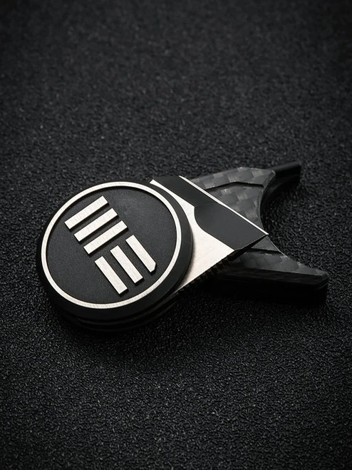 This model of the Quark has a two-tone Bohler M390 blade, black and silver 6Al4V titanium handle, and a magnetic 6Al4V titanium and carbon fiber sheath with a stainless steel chain.