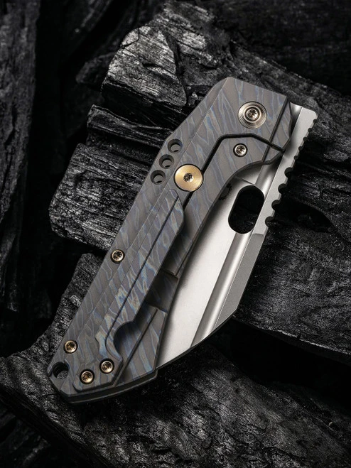 This model has a stonewashed CPM S35VN blade and a tiger stripe flamed titanium handle with bronze hardware.Â