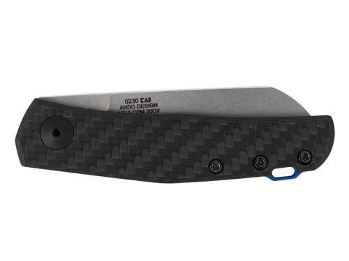 The handle is carbon fiber, making this an exceptionally light and easy carry. The backspacer is anodized in blue and features an integrated lanyard attachment. The knife’s unique features and the clean Anso design make the 0230 a simple, yet extraordinary knife.